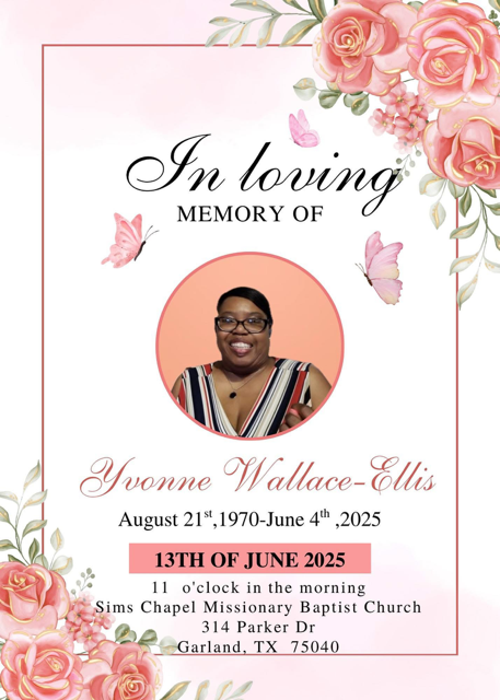 It is with heartfelt sympathy that we notify you of the Homegoing Services for Yvonne Wallace Ellis. Yvonne was the daughter of the late Henry Wallace, who served as our National Assistant Goodwill Ambassador and a member of the D/FW Chapter. Please keep the family lifted in your prayers.